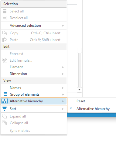 Alternative hierarchy is a hierarchy of any other dictionary linked with the hierarchy of the main dictionary for element mapping or a custom hierarchy created on editing dimensions or adding a new calculated element.