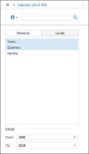 When working with calendar dimension element selection one can choose selection type in the desktop application: elements or levels.