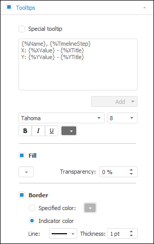 Tooltips are enabled by default. To make tooltips visible, select the checkbox in the Tooltips tab title on the side panel. To set up tooltips, use the same side panel tab.