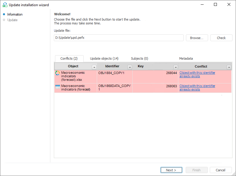 The Conflicts tab of the Information page displays different conflicts (except for the mandatory access control conflicts), which occur during the update check.