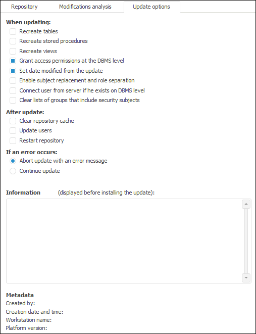 Set Date Modified from the Update. The checkbox is deselected by default. After completing the update, modification dates of objects contained in the update match the update installation date. When the checkbox is selected, modification dates of updated objects correspond to real dates of object changes in the repository at the time the update is created.