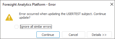 Ignore All Similar Errors. The checkbox is deselected by default, and every similar error is displayed in the notification window on continuing the user permissions update. On selecting the checkbox and continuing the update similar errors are not displayed in the notification window.