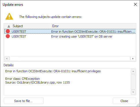 If errors occurred during the user permissions update, the Update Errors dialog box containing the list of all errors occurred during the update opens: