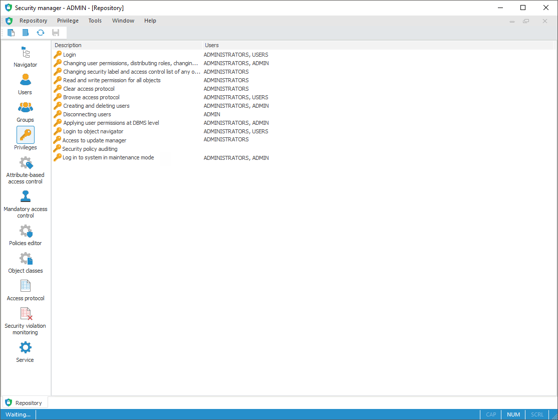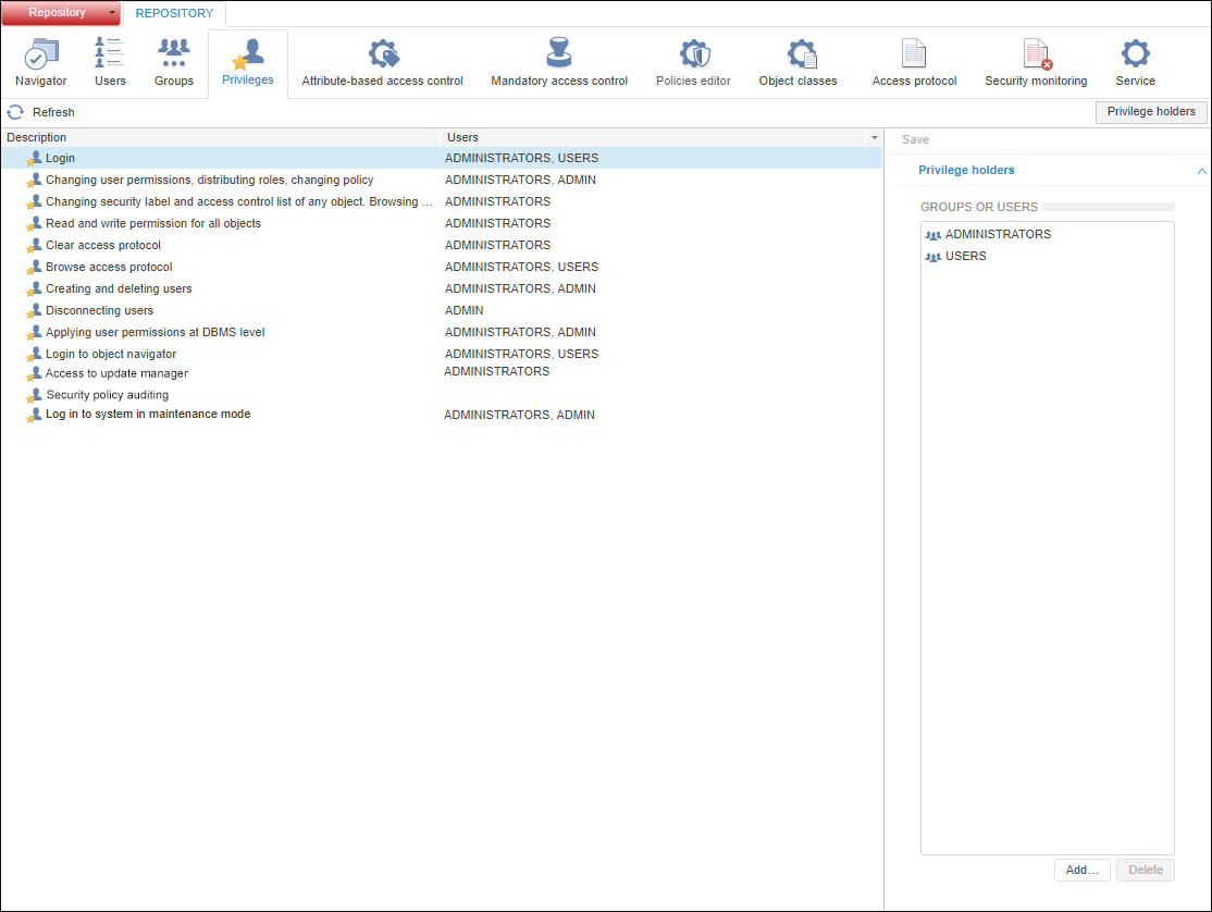 To distribute privileges between system users, use the Privileges section on the navigation panel.