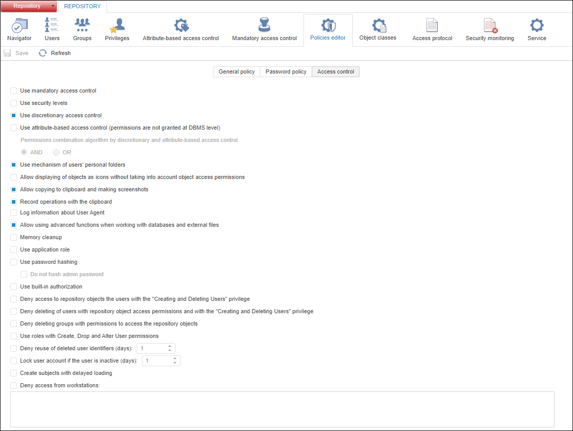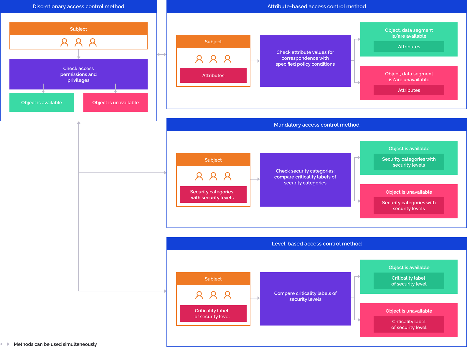 To get detailed information about access control methods, see the Setting Discretionary Access Control Method, Setting Mandatory Access Control Method, Setting Up Level-Based Access Control Method, Setting Up Attribute-Based Access Control Method sections.