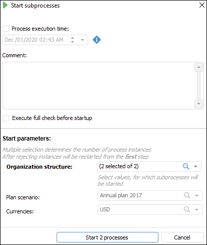 The Start Subprocesses dialog box opens to set subprocess startup parameters. Values of the splitting parameter, for which subprocess instances are started, are selected by default in the Start Parameters area: