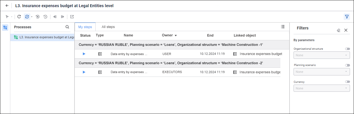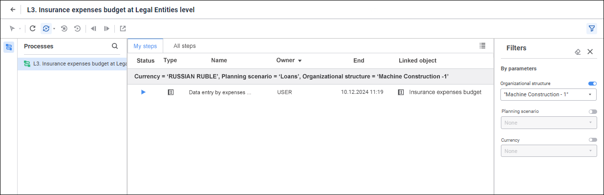 In the custom monitoring mode when the list of process steps assigned to the user for execution is displayed in the working area on the My Steps and All Steps tabs.