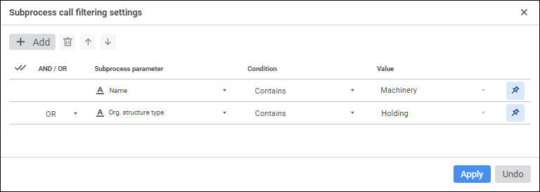 To filter subprocess start by splitting parameter attributes or by its single values, set up subprocess call conditions.