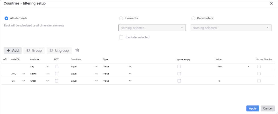 To select dimension elements, by which a block will be calculated, use the <dimension name> - filtering setup dialog box:
