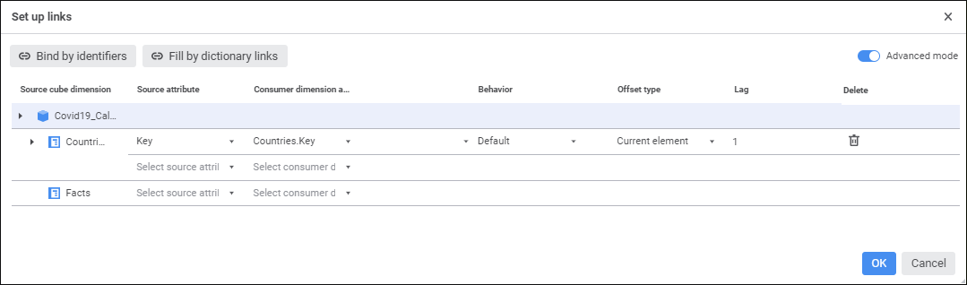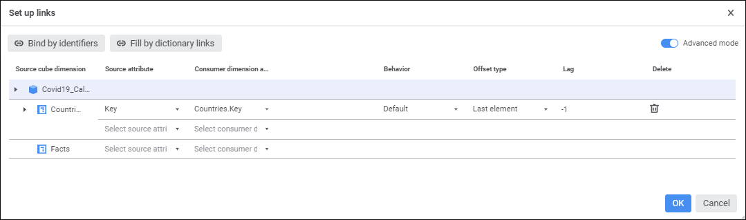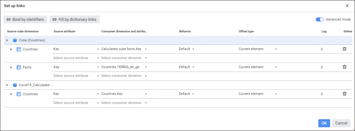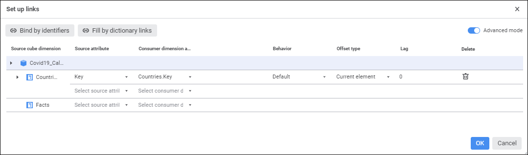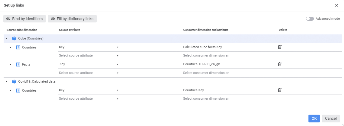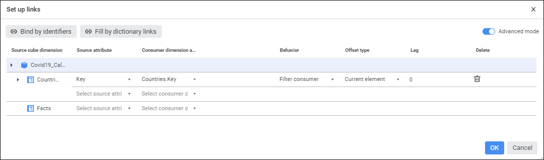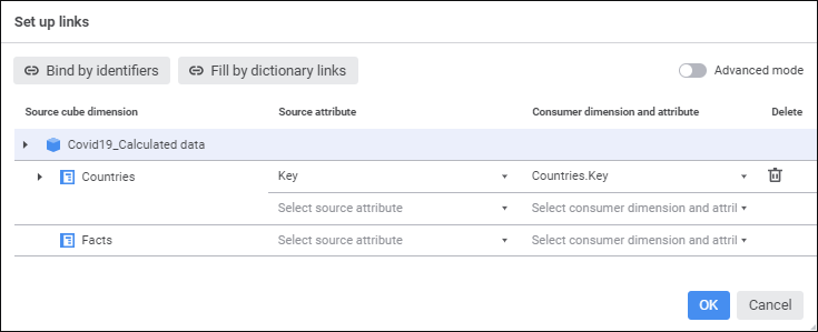 To set up links between data source and data consumer dimensions, use the Set Up Links dialog box. A link can be set up in simple and advanced modes. The dialog box appearance differs depending on the setup mode: