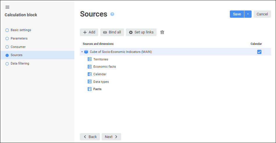Data sources can be selected and set up on the Sources page in the calculation block editing wizard: