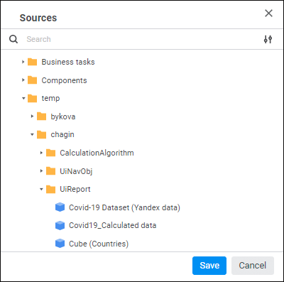 Data sources determine the objects, based on which a calculation block will be executed. The following repository objects can be used as data sources: