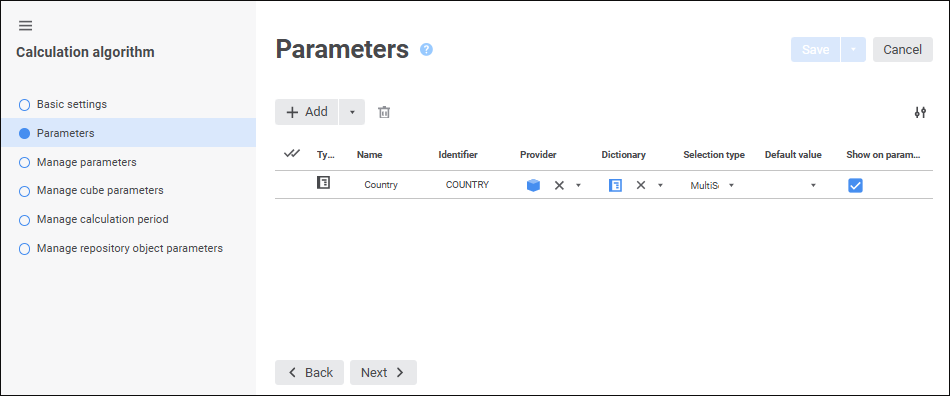 Calculation algorithm parameters can be added on the Parameters page in the calculation algorithm settings editing wizard. To set parameter values that will be used on algorithm calculation, use the parameters panel. The order of parameters display on this panel matches with the order of parameters on the Parameters page: