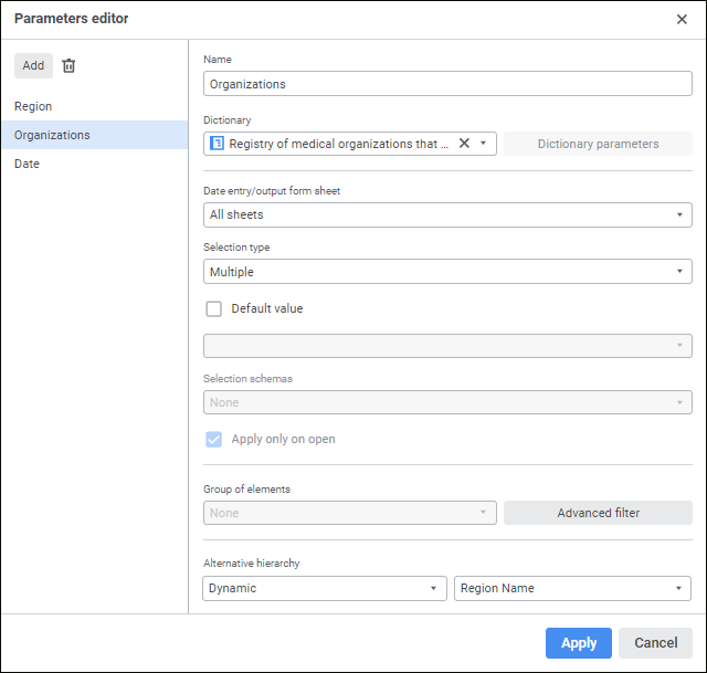 The parameter is used to dynamically control data displayed in the data entry form. For example, the list of organizations is selected as a parameter for registry data entry form, on changing selection in the parameter, the working area of data entry form will display registry data corresponding to the required organization.