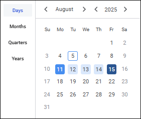 Select the calendar dictionary level to work with. For example: days, months, quarters, or years. One can work only with the levels that were determined in calendar dictionary settings. Calendar grid values change according to the selected calendar dictionary level.