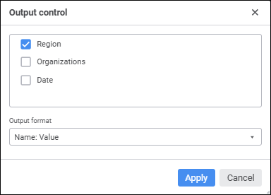 Insert button in the Header or Footer groups of parameters on the side panel and select the Control Value option. The Control Value Output dialog box opens: