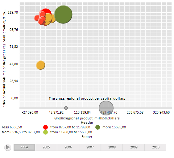 To execute the example, the HTML page must contain the BubbleChart component named bubbleChart (see Example of Creating the BubbleChart Component). Change legend contents alignment, set legend header and footer, hide data absence label, set that legend will overlap the bubble chart main area, show legend type, and process the HeaderClicked event: