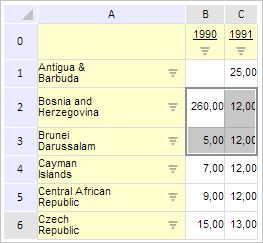 To execute the example, the HTML page must contain the ExpressBox component named expressBox (see Example of Creating the ExpressBox Component) and with the loaded table in the express report workspace. Before executing this example the express report table looks as it is shown in the page with description of the GridView class.