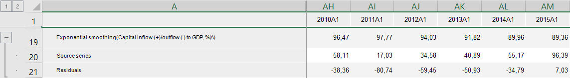 After the method is applied, a series with the name of the Exponential Smoothing(<Series_Name>) type and containing calculation results is added to the data table for each of the selected series. For example: