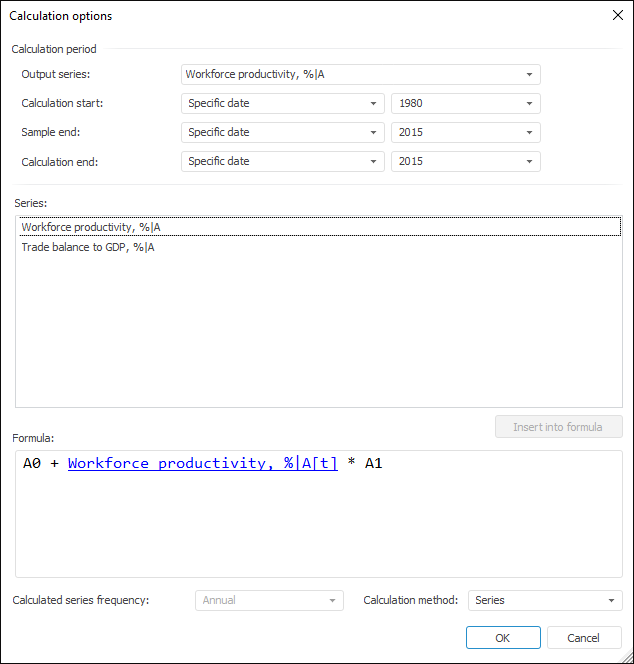 To change basic calculation options (output series and confidence limits relevance), use the Parameters tab in the side panel.