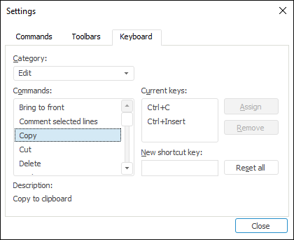 Current Keys/Current Keys. This box displays the customized shortcut keys for the selected command. To remove the current shortcut key, select it and click the Remove button. To assign a new shortcut key for the selected command, enter a new combination in the New Shortcut Key box. The shortcut key is entered automatically by pressing the appropriate keys. Then click the Assign button. To reset all the current shortcut key settings, click the Reset All button.