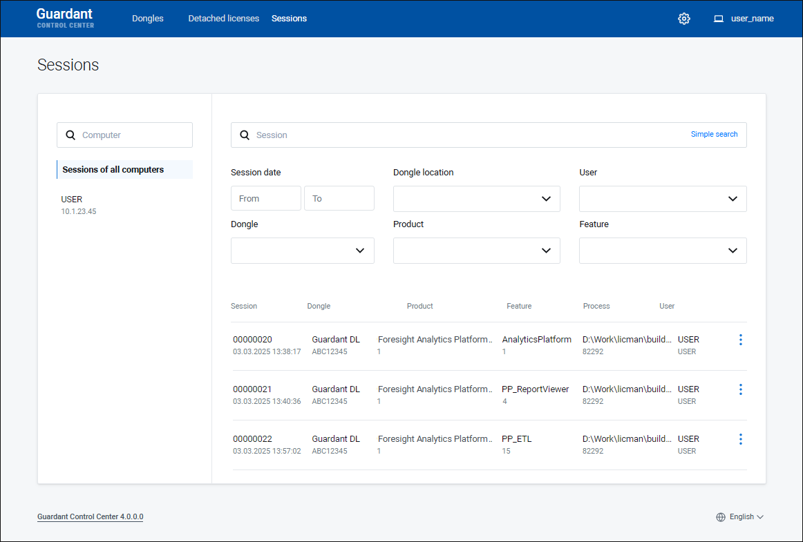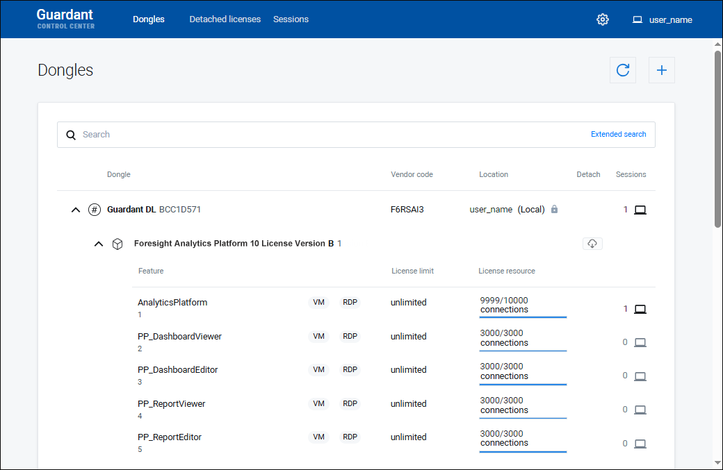 To work with a license, use the Dongles section. The section displays the licenses activated in Guardant License Wizard containing a set of features (components):
