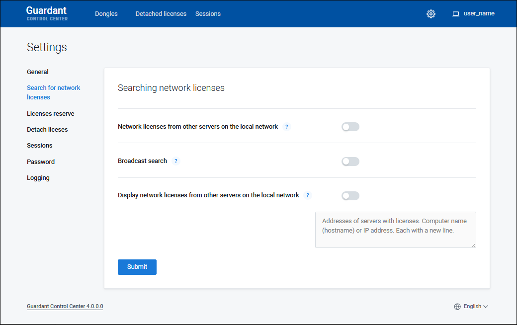 Search for Network Licenses. Toggle the Network Licenses from Other Servers on the Local Network and Broadcast Search switches to inactive state: