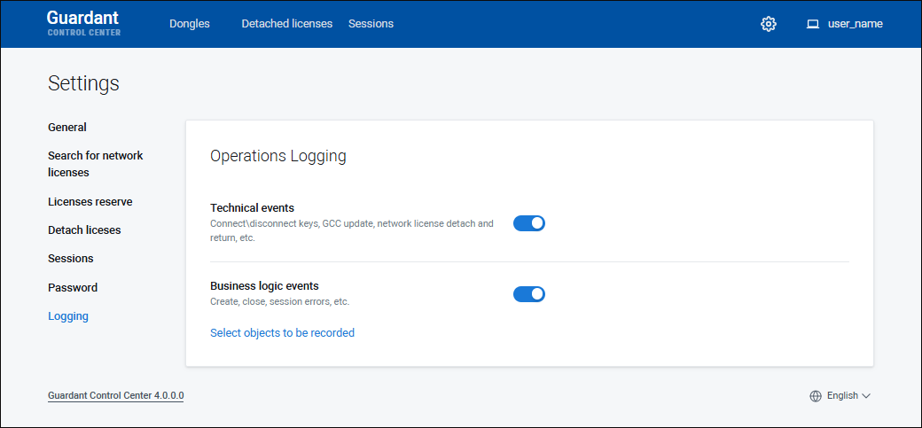 Logging. Toggle the Technical Events and Business Logic Events switches to active state: