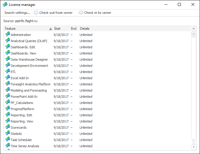 The license source and its current state are displayed above the list of features in case when there is no license server connection or when there is a limited number of days to use temporary local license. The license source can be a license server, license file path.