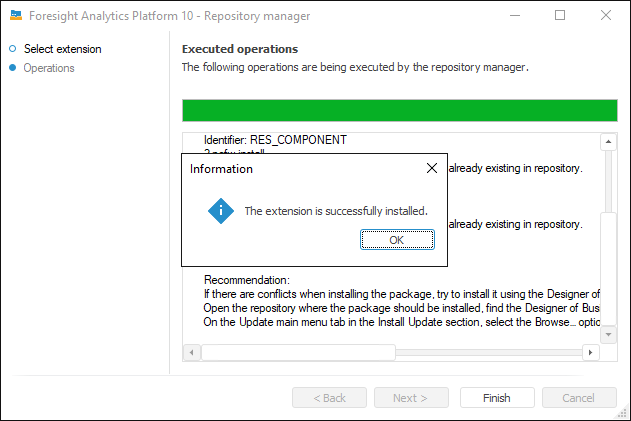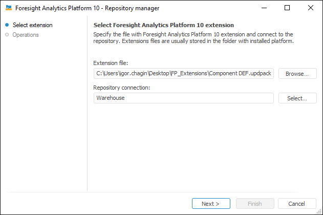 Extensions are installed from a file to the current repository. The required extension files are included in software package of Foresight Analytics Platform and are contained in the FP_Extensions folder.