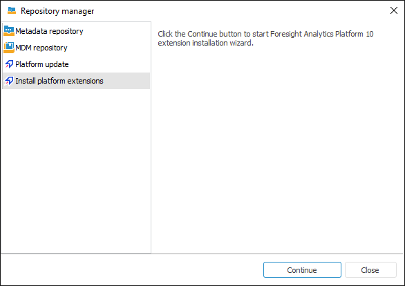 Primary installation of extensions is executed by means of the repository manager included in Foresight Analytics Platform.