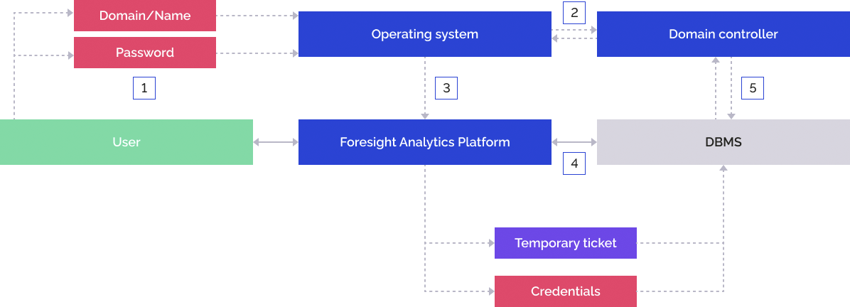 Foresight Analytics Platform sends the specified credentials and the temporary ticket to the DBMS server.