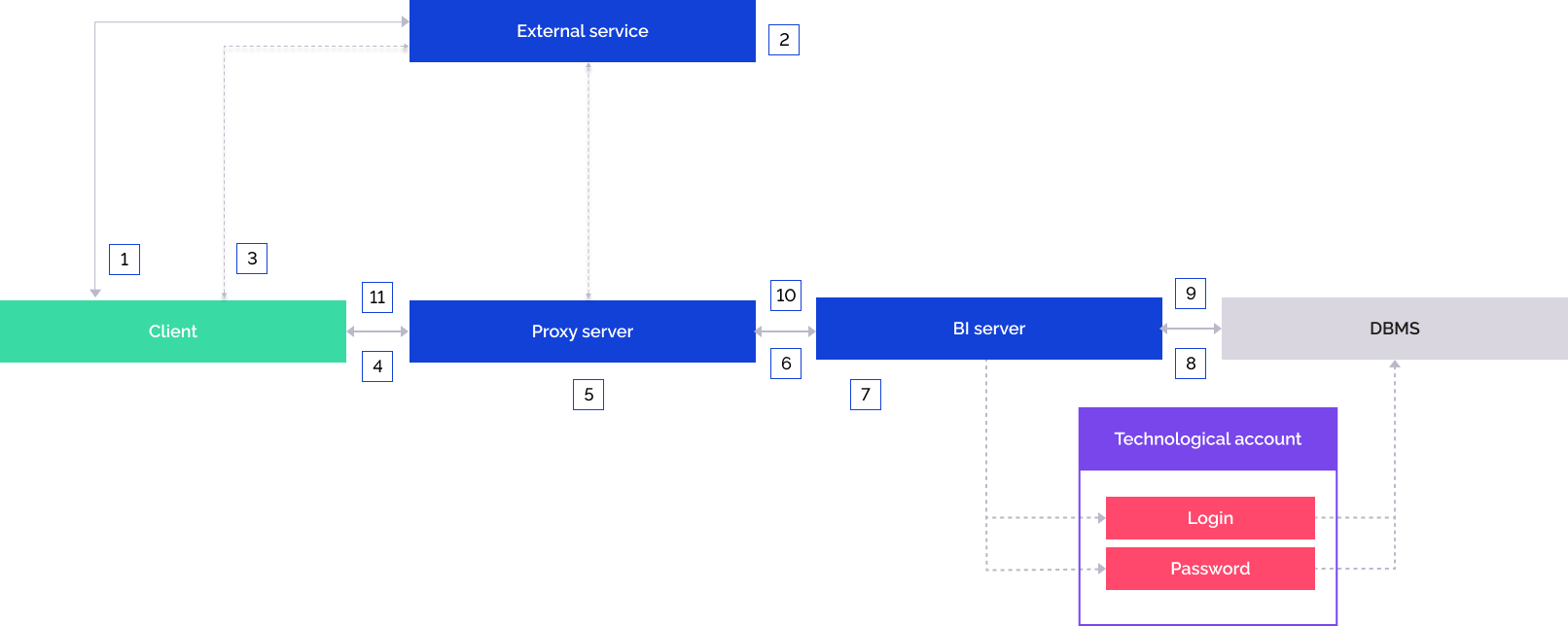 NOTE. Interaction between the external authentication service and the proxy server, which adds headers to queries, is not described in this help and can be implemented at administrator's discretion. The trust between the BI server and the proxy server, which adds headers to queries, is provided by checking with JWT token signature.