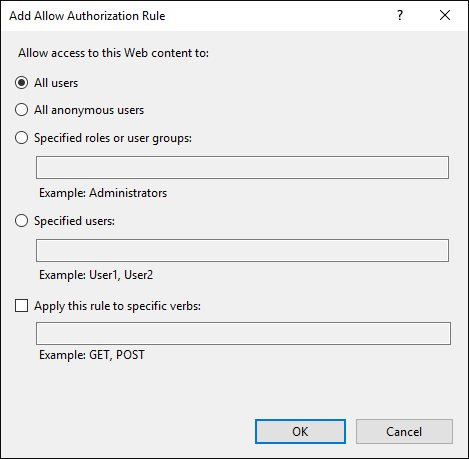Select the All Users radio button in the Add Allow Authorization Rule dialog box and click the OK button: