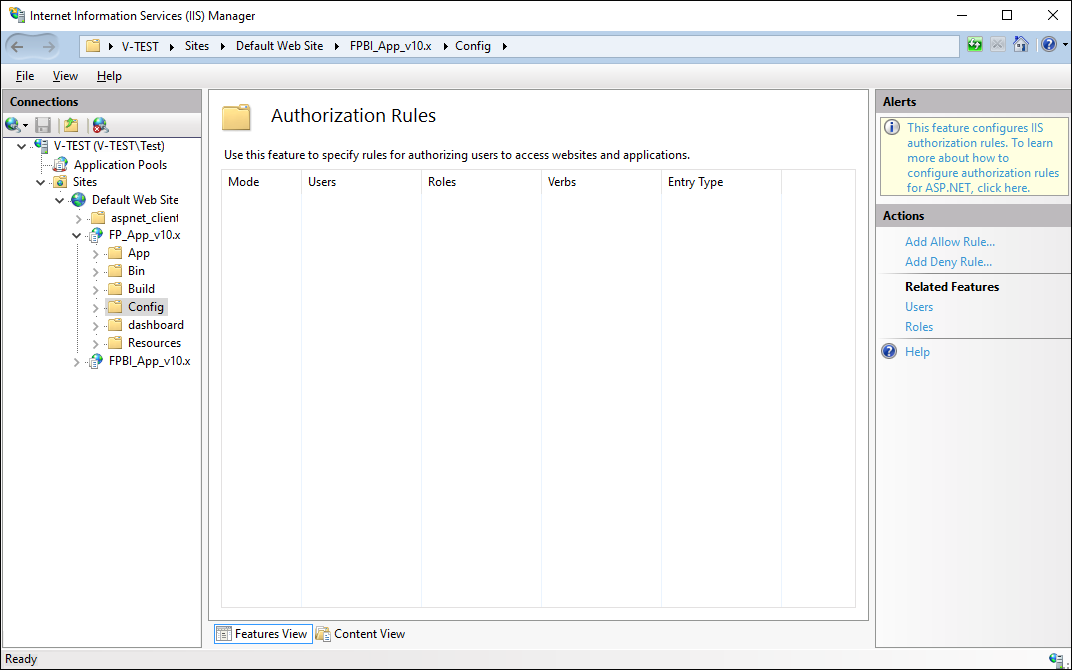 If when connecting IIS services the URL Authorization checkbox is selected in Windows OS features in the Security section, create an authorization rule the IIS manager to authorize users in the web application.