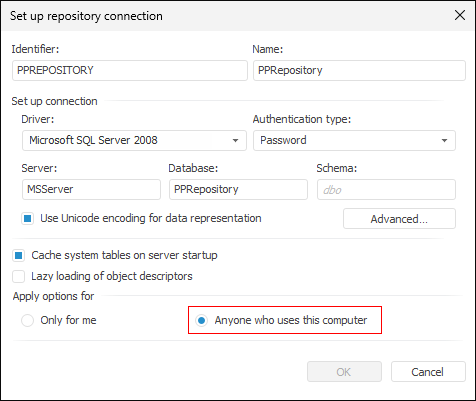 If any problems occur when working with web application of Foresight Analytics Platform check check if the Anyone Who Uses This Computer checkbox is selected in repository connection settings in the desktop application.
