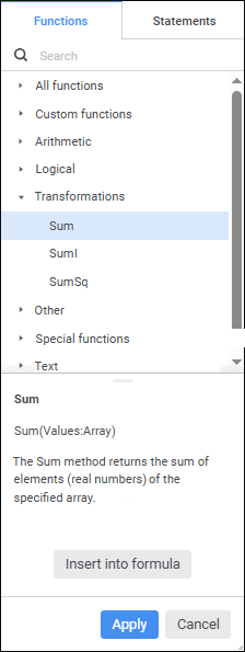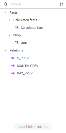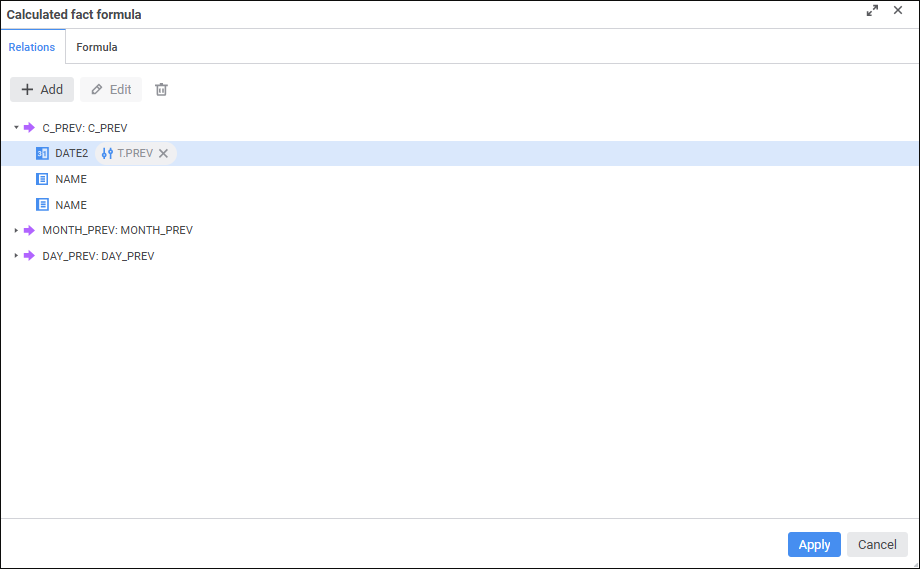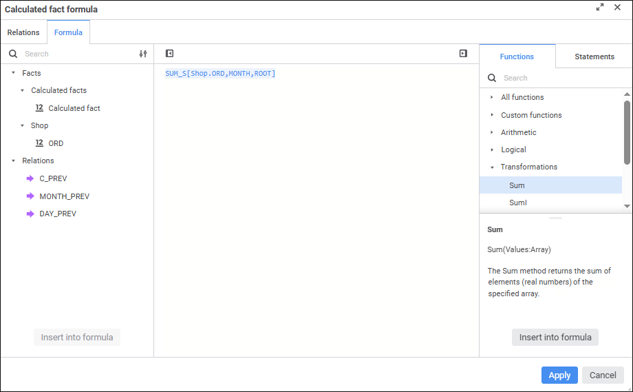 To apply the specified formula and close the Calculated Facts Formula dialog box, click the Apply button. The saved formula will be displayed in the formula bar in the Create Calculated Fact or Calculated Fact Settings dialog box.
