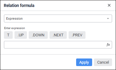 Expression. Applying the relation results in the element, which index is calculated by the specified expression. The expression is set using the button located next to the edit box or the expression editor. An expression should be started from the current dimension element, to do this, use the T button. Next, one can specify the shift, for example, T.PREV, T.PREV.UP, T.UP.NEXT, and so on. Use the buttons to create an expression: