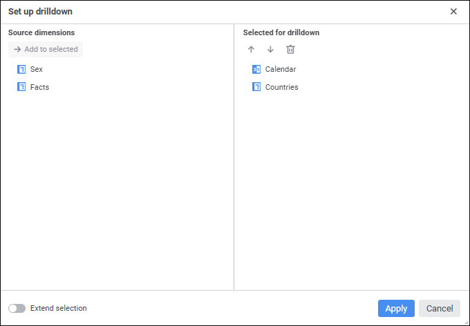 To set up available dimensions during drilldown or drillup and to set up element selection behavior, use the Set Up Drilldown dialog box: