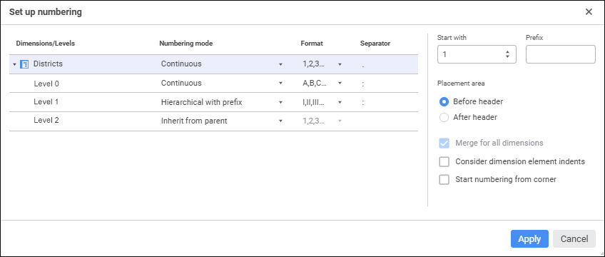 Numbering settings for dimensions and levels