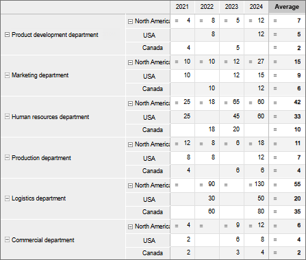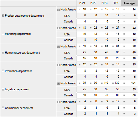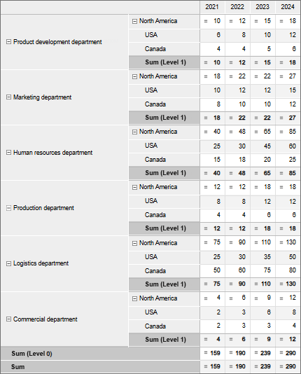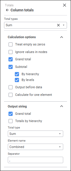 Total values of the selected types will be automatically calculated. If dimension element data has the Text/Date/Time format, totals are calculated only for the following total types: Maximum, Minimum, Number of Empty Cells, Number of Non-Empty Cells.