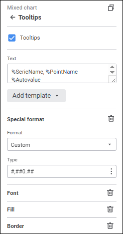 Select the Tooltips checkbox to show tooltips on the chart and set the parameters: