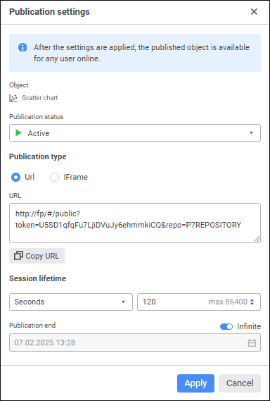 NOTE. Publishing objects is available only for the users with administrator permissions. Published objects are available in external sources without authorization for any internet users.