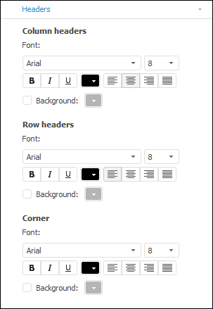 To set up table heading, use the Headers side panel tab. A heading consists of column and row headers and table corner.