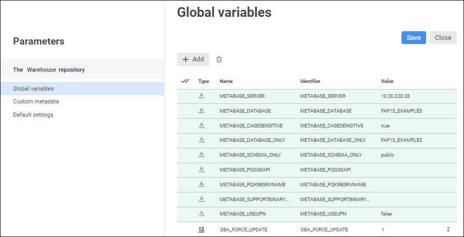 METABASE_CASESENSITIVE. The variable value corresponds to the use of Match Case when Working with DBMS checkbox in repository settings for the following driver types: Microsoft SQL Server, Microsoft SQL Server (ODBC), PostgreSQL.