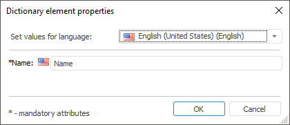 As a result, the multilingual dictionary will be created. Working with elements of such dictionary is the same as with elements of standard dictionaries. The difference is in inputting values for string attributes for elements: it is required to select the language, for which value will be applied.
