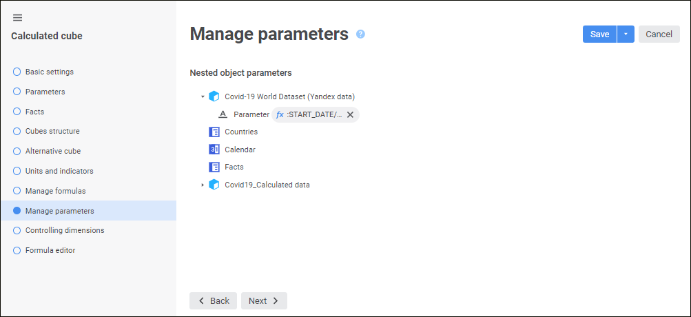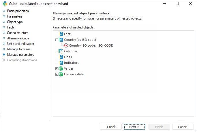 NOTE. Nested objects parameters management is available if parameters are created for the cube on the Parameters page.