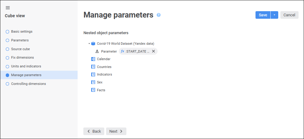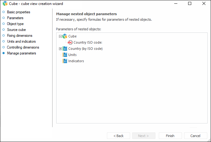 NOTE. The Manage Parameters page is available in the wizard if parameters are created for the cube on the Parameters page.