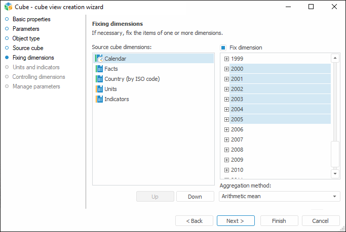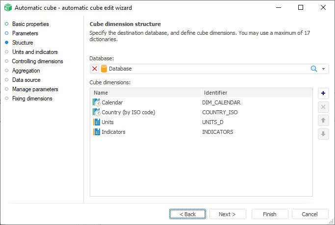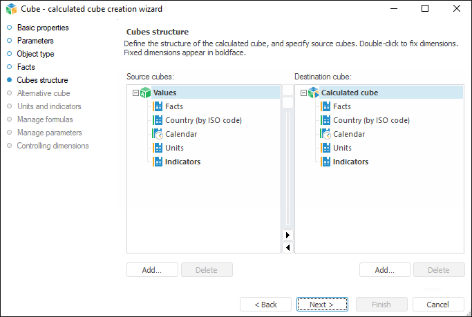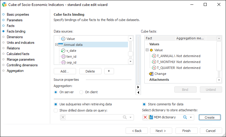 Standard Cube. Cube structure is determined by the set of dictionaries and the combination of facts. Facts describe the data stored in dimensions that are determined by a set of cube dictionaries. In other words, dictionaries determine the coordinate axes of the cube and facts determine various values in each point of the obtained coordinate system. Along with the facts that store data, one can create calculated facts and relations in a cube. Calculated fact values are determined by a formula based on data of other facts or relations. Relations enable the user to get fact values by shifting relative to the current calculation point. It enables the user, for example, to calculate difference between the current and any previous or next value. Various data aggregation types can also be set up in a cube: