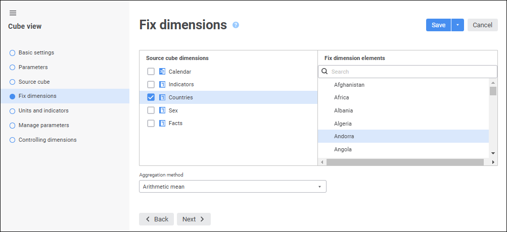 Cube View. The cube based on the data of another cube but having smaller dimensions. The number of dimensions is reduced by means of fixing dimensions: